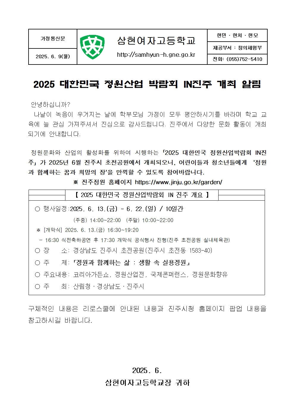 「2025 대한민국 정원산업박람회 IN 진주」 개최 안내 가정통신문